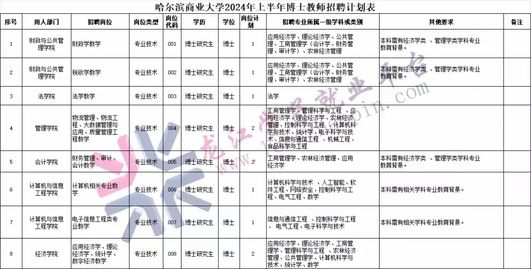 (八)各崗位的數量、專業(yè)及具體要求,詳見《哈爾濱商業(yè)大學2024年上半年博士教師招聘計劃表》(附件1)。