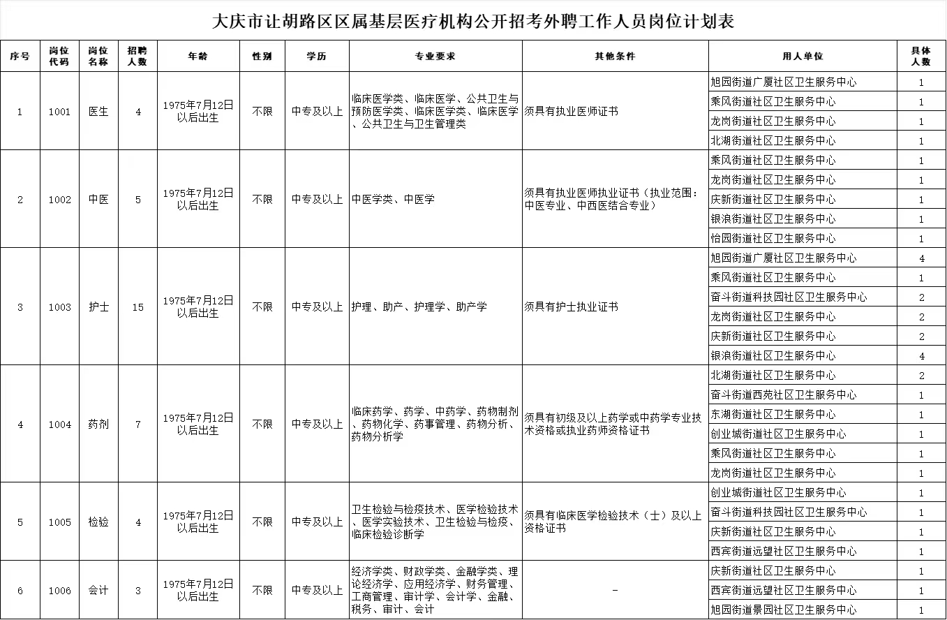 (四)具有符合招聘崗位要求的學(xué)歷、專業(yè)、年齡等條件,詳見《大慶市讓胡路區(qū)區(qū)屬基層醫(yī)療機(jī)構(gòu)公開招考外聘工作人員崗位計(jì)劃表》(附件1);