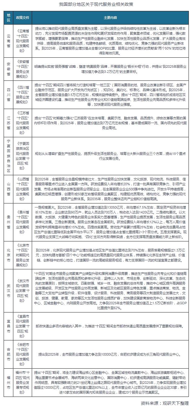 地方層面上,例如云南省發(fā)布的《云南省“十四五”現(xiàn)代服務(wù)業(yè)發(fā)展規(guī)劃》,提出將以推動現(xiàn)代服務(wù)業(yè)高質(zhì)量發(fā)展為主題,以深化服務(wù)業(yè)供給側(cè)結(jié)構(gòu)性改革為主線,以改革創(chuàng)新為根本動力,充分發(fā)揮市場配置資源的決定性作用和更好發(fā)揮政府作用,聚焦重點領(lǐng)域,優(yōu)化發(fā)展環(huán)境,強化數(shù)字賦能,增強要素保障,推動生產(chǎn)性服務(wù)業(yè)融合化發(fā)展,加快生活性服務(wù)業(yè)品質(zhì)化發(fā)展,擴大服務(wù)業(yè)有效供給,提高服務(wù)效率和服務(wù)品質(zhì),構(gòu)建特色鮮明、優(yōu)質(zhì)高效、結(jié)構(gòu)優(yōu)化、競爭力強的現(xiàn)代服務(wù)產(chǎn)業(yè)新體系。到2025年,云南省服務(wù)業(yè)增加值占全省GDP的比重、服務(wù)業(yè)對經(jīng)濟增長的貢獻率“兩個50%”的地位將得到有效鞏固。